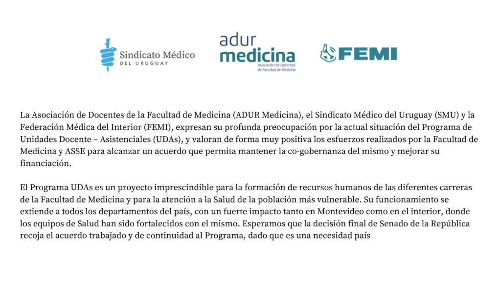La Asociación de Docentes de la Facultad de Medicina (ADUR Medicina), el Sindicato Médico del Uruguay (SMU) y la Federación Médica del Interior (FEMI), expresan su profunda preocupación por la actual situación del Programa de Unidades Docente – Asistenciales (UDAs), y valoran de forma muy positiva los esfuerzos realizados por la Facultad de Medicina y ASSE para alcanzar un acuerdo que permita mantener la co-gobernanza del mismo y mejorar su financiación.