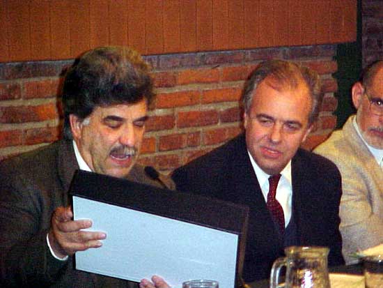 el Dr. Barrett DÍAZ POSE hace entrega al Dr. Guido Berro de una placa en reconocimiento del SMU a los 125 años de la Cátedra de Medicina Legal