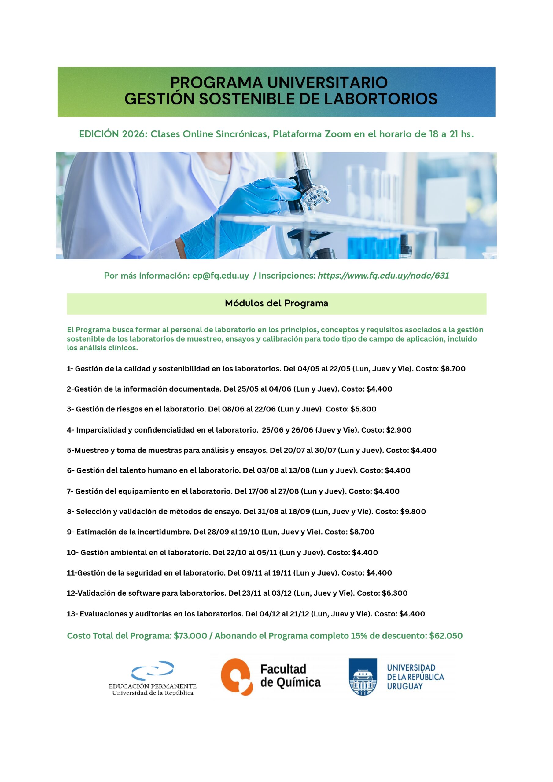 La Unidad de Educación Permanente de la Facultad de Química de la UdelaR abrió las inscripciones para el Programa Universitario “Gestión Sostenible de Laboratorios” – Edición 2026.