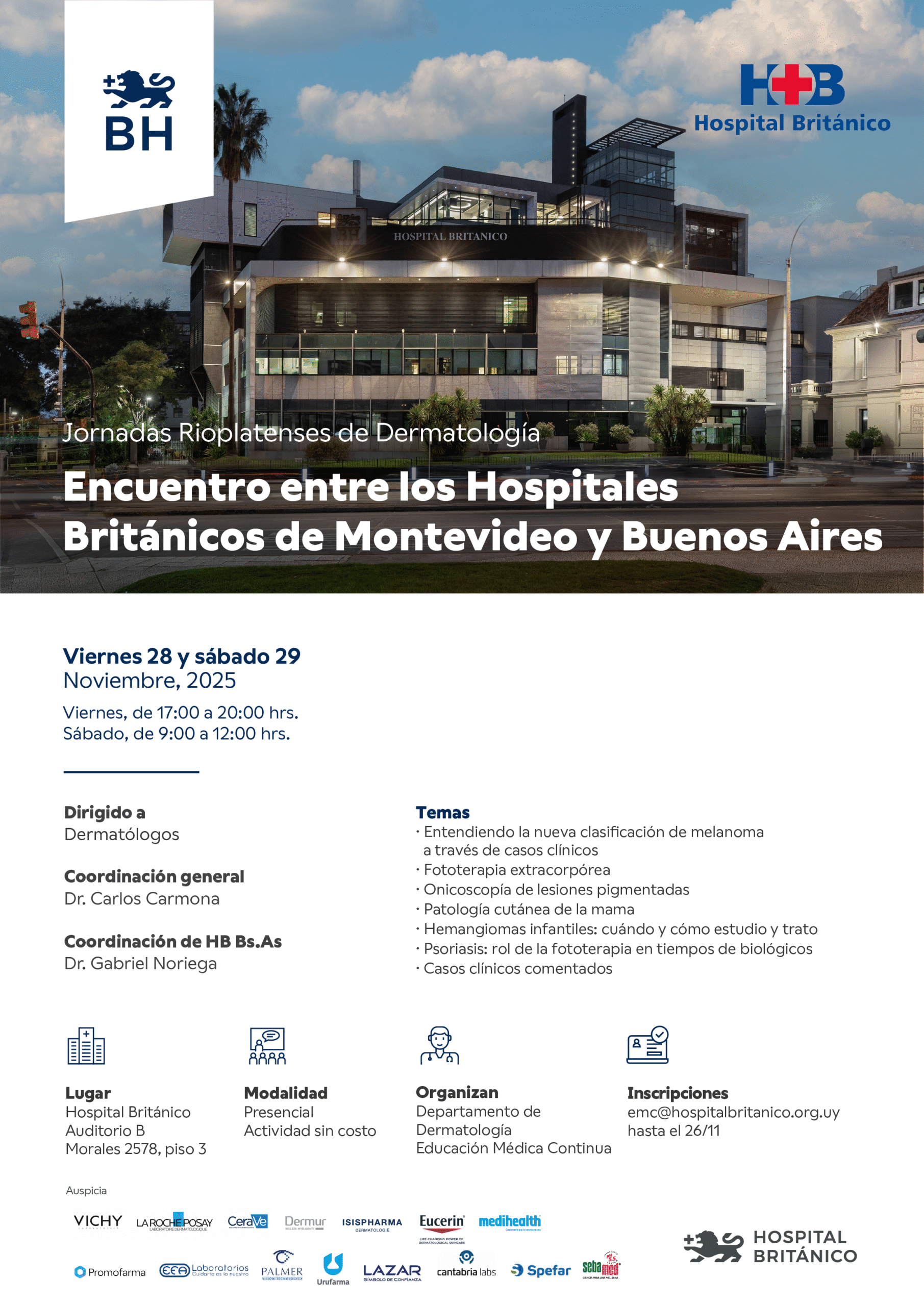 El Hospital Británico invita a participar de las «Jornadas Rioplatenses de Dermatología: Encuentro entre los Hospitales Británicos de Montevideo y Buenos Aires», que se realizarán los días 28 y 29 de noviembre. Actividad sin costo.