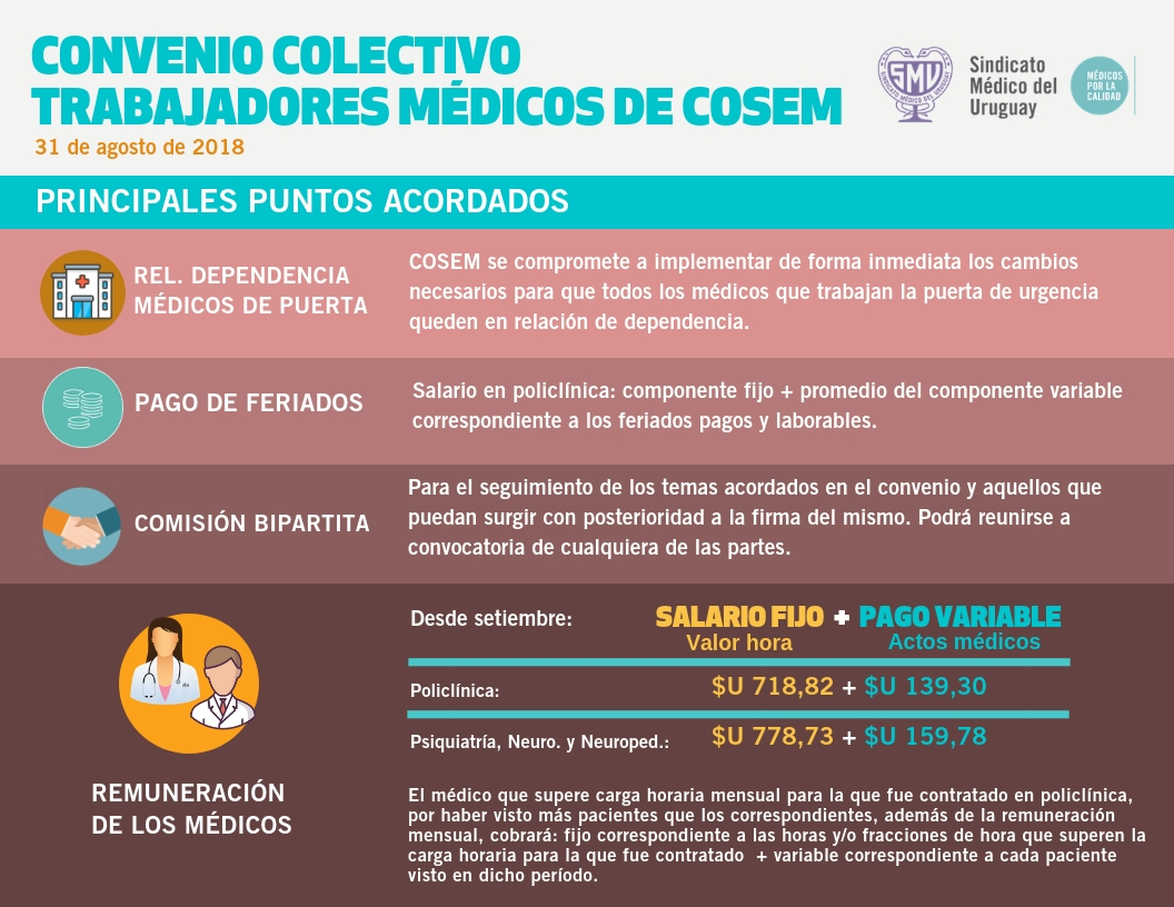 El pasado 31 de agosto y en el marco de la negociación bipartita entre el Núcleo de Base SMU – Cosem y la empresa, las partes firmaron un acuerdo con el objetivo de reformular la composición del salario que percibe el personal médico de la mutualista, así como también el establecimiento de otras condiciones de trabajo.