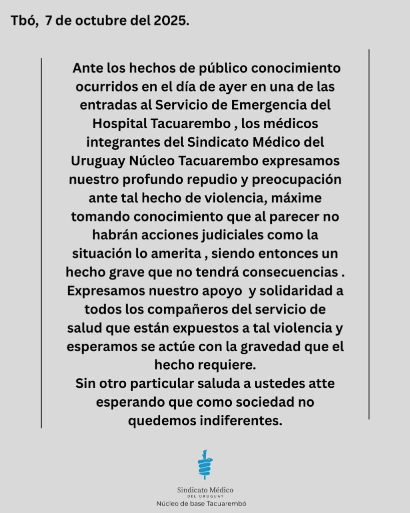 Ante los hechos de público conocimiento ocurridos en el día de ayer en una de las entradas al Servicio de Emergencia del Hospital de Tacuarembó, los médicos integrantes del Sindicato Médico del Uruguay Núcleo Tacuarembó expresamos nuestro profundo repudio y preocupación ante tal hecho de violencia, máxime tomando conocimiento que al parecer no habrán acciones judiciales como la situación lo amerita, siendo entonces un hecho grave que no tendrá consecuencias.