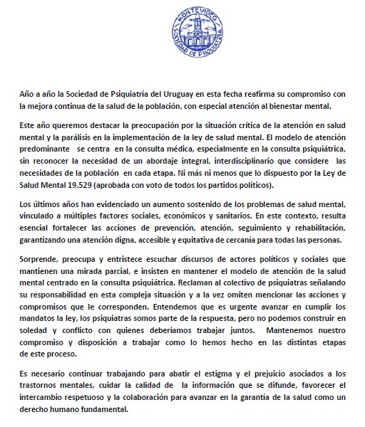 Recibimos y publicamos: Comunicado de la Sociedad de Psiquiatría del Uruguay