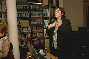 La Lic. Gabriela González (Jefa de Biblioteca del SMU), durante la exposición interactiva.