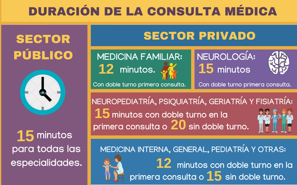 Actualmente, la estructura de las agendas médicas está regulada por dos convenios: uno para el sector púbico (2010), donde se estipulan 15 minutos por paciente, independientemente de la especialidad; y otro para el sector privado (2014), donde se establece el tiempo que debe dedicar a la consulta cada especialidad, el que va de 12 a 20 minutos – VER RECUADRO –.